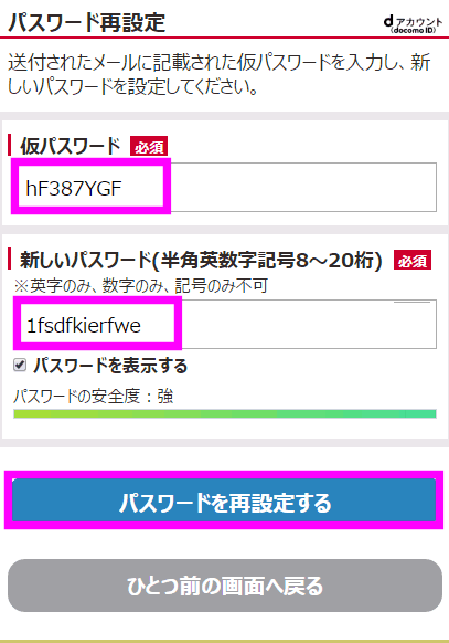 再び先ほどの画面に戻り、「仮パスワード」を入力し、新しいパスワードを入力します。