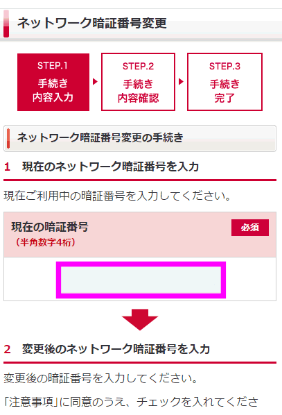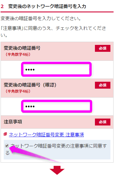 「ネットワーク暗証番号変更の注意事項に同意する」にチェックを入れ、下にスクロールします。