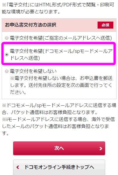 さらに下にスクロールして、「電子交付を希望(ドコモメール/spモードメールアドレスへ送信)」にチェックを入れ、「次へ」をタップします。