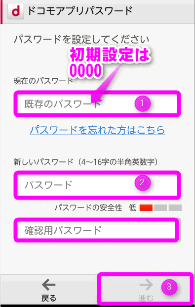 ドコモアプリパスワードの初期設定は、「0000(数字のゼロ4つ)」になります。