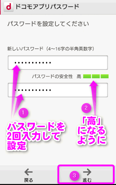 その後「確認用パスワード」にも同じパスワードを入力し、③「進む」をタップします。