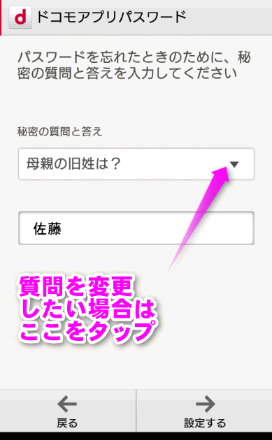 ドコモアプリパスワードを忘れた時に必要な秘密の質問を設定します。