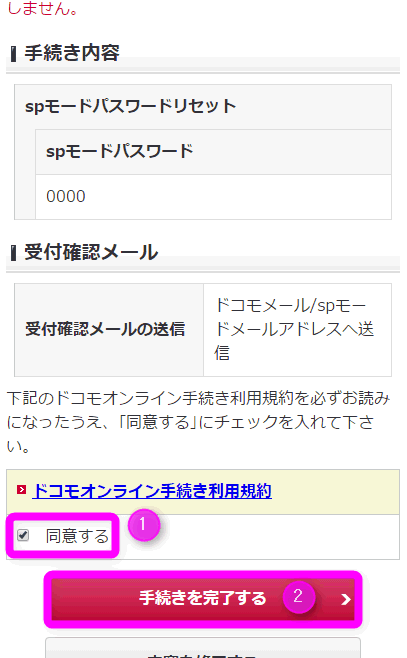 ①「同意する」にチェックを入れ、②「手続きを完了する」をタップします。