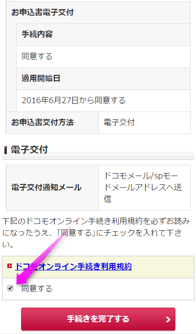 入力内容の確認画面になるので、「同意する」にチェックを入れ「手続きを完了する」をタップします。