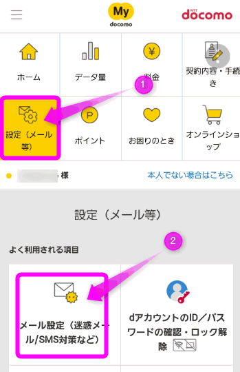 すると「設定(メール等)」が表示されるので、「メール設定(迷惑メール/SMS対策など)」をタップします。