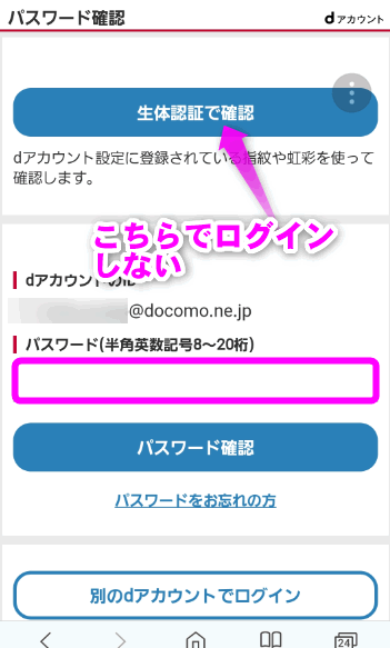 もう一度dアカウントへサインインします。このとき「生体認証で確認」でログインするとうまくいかないので、下のパスワードを入力して「パスワード確認」をタップしてください。
