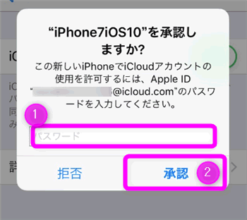 ここでAppleアカウントのパスワードを入力し、②「承認」をタップすればもう1台のiPhoneでもキーチェーンが使えるようになります。