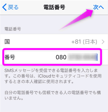 キーチェーンはセキュリティーコードだけでは承認できなくて、登録した電話番号に届いた確認コードを入力しないと使えません。確認コードが届く電話番号を入力し、「次へ」をタップします。