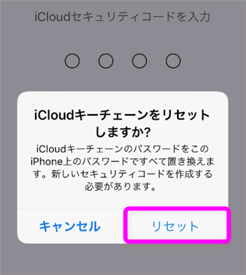 するとほんとうにiCloudキーチェーンをリセットしていいか聞いてくるので、「リセット」をタップします。