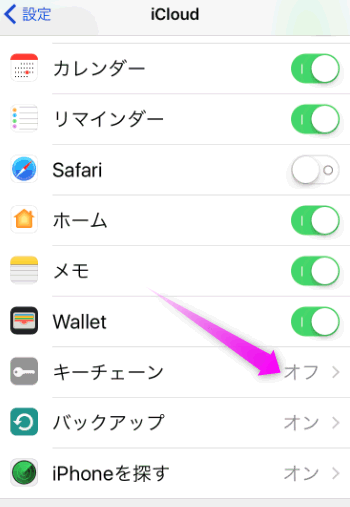 下にスクロールしていくと「キーチェーン」という項目があります。2段階認証を設定していない人は、一度iCloudからログアウトすると次にログインした時に「キーチェーン」がオフになります。