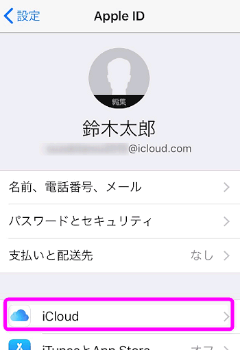 設定を開き、自分の名前をタップするとこのような画面になります。