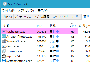 パスワード解析中は、パソコンの動作が重くなります。CPUの使用率は69%にも達していました。
