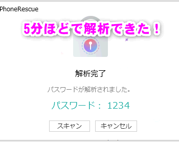 が、簡単なパスワード(今回は1234)だったので、5分以内に解析完了。