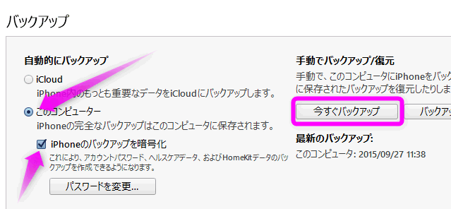 iPhoneをパソコンでバックアップするときに、「iPhoneのバックアップの暗号化」にチェックを入れておくと、
