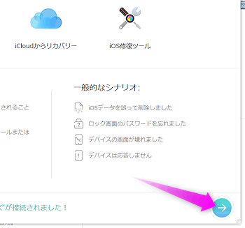 iPhoneを認識すると、このように「お使いの"iPhone"が接続されました!」と表示されます。