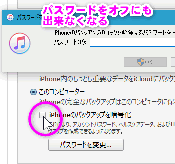 「iPhoneのバックアップを暗号化」のチェックが外れました。