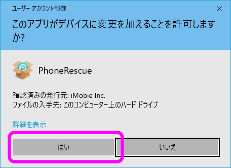「ユーザーアカウント制御」が表示されるので、「はい」をクリック。