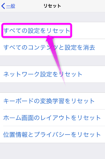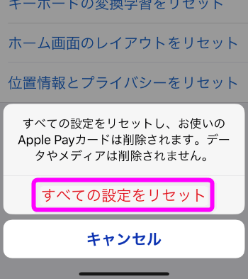 最後に本当にリセットしてもいいか確認してくるので、「すべての設定をリセット」をタップします。