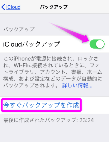 「iCloudバックアップ」がオンになっていることを確認し、「今すぐバックアップを作成」をタップします。