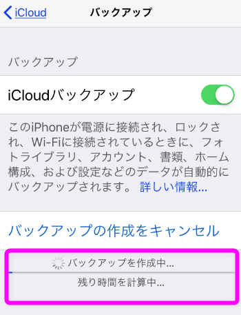 なお、iCloudへのバックアップはWi-Fiに接続した状態でないと出来ないので、注意してください。