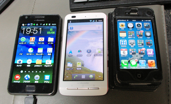 1円で売られていたパナソニックのスマートフォン、P-07Cを購入し(記事:スマホを安く手に入れるにはを参照)、7インチタブレットのNexus 7を購入。さらにiPhone5を購入し、アンドロイドのOptimus itを購入。