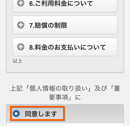 スクロールしていくと「同意します」というボタンがあるので、タップします。