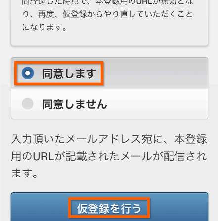 留意事項が表示されるので一読したら、「同意します」にチェックを入れ、「仮登録を行う」をタップします。