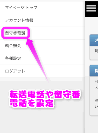 留守番電話をオンにするには、左上の「メニュー」をタップしたら、「留守番電話」をタップ。