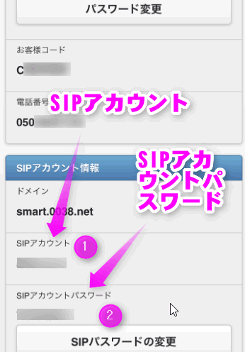 下にスクロールしていくと、①「SIPアカウント」と②「SIPパスワード」が乗っているので、このふたつをメモしておきます。