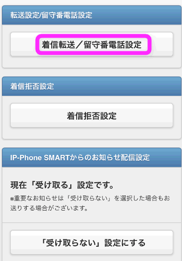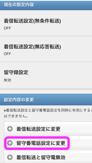 留守番電話や転送電話などがオンになっているか表示されます。OFFになっている場合は、「留守番電話設定に変更」の部分をタップします。