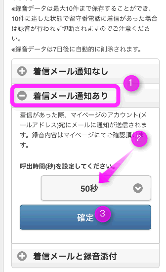 ①「着信メール通知あり」を選択すると、不在着信があった場合、登録したメールアドレスに知らせてくれます。