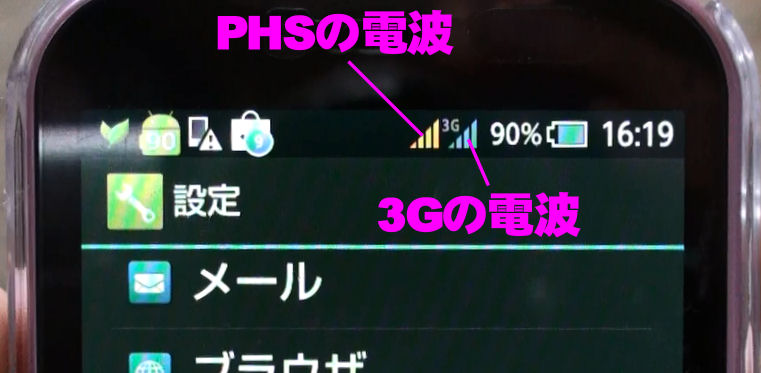 実際には、このようにPHSのアンテナマーク(黄色)と3Gのアンテナマーク(青色)の2つが表示されます。
