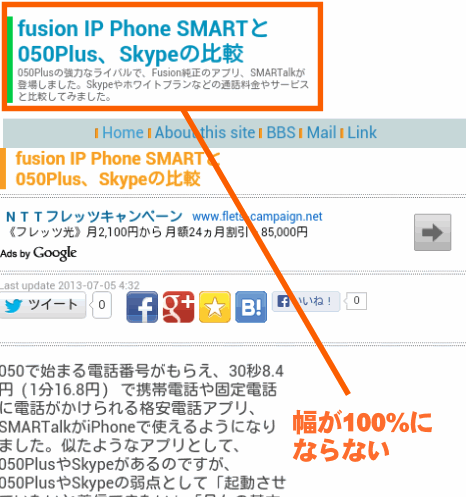 CSSでWidthを100%など指定しても、アンドロイドのブラウザで見ると、有効にならない場合がいあります。その場合の解決策。