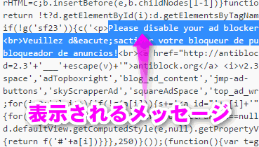 「Please disable your ad blocker!<br>Bitte deaktiviere Deinen Werbeblocker!<br>Veuillez désactiver votre bloqueur de publicité!<br>Por favor, desactive el bloqueador de anuncios!」の部分を日本語に変更しておきます。
