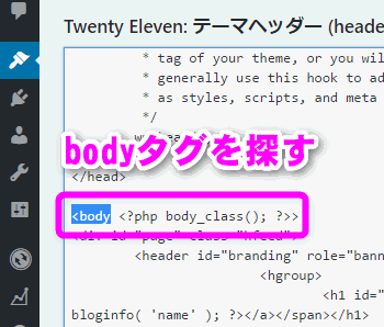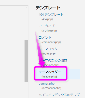右側の「テンプレート」の中から「テーマヘッダー(header.php)」を探し、クリックします。