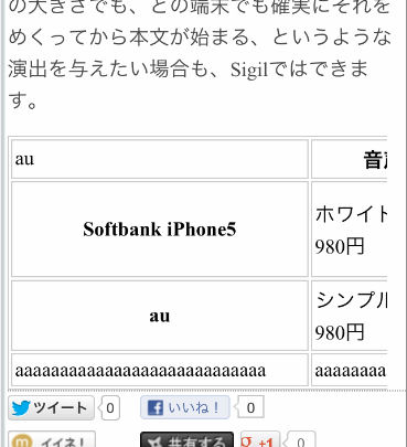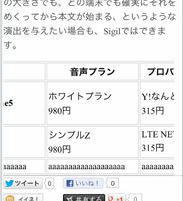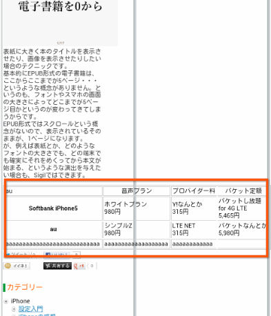 iPhoneで表示させると、ページ全体は横にスクロールできませんが、テーブルの部分だけ横にスクロールできるようになります。