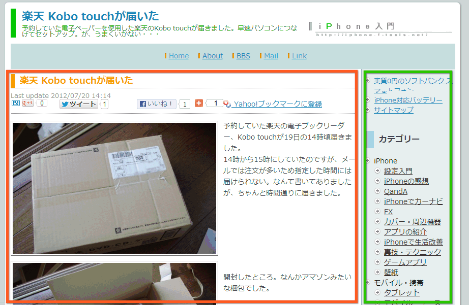 スマートフォン用の表示は、「横:320ピクセル」が標準なのですが、ページ幅を320ピクセルに合わせてしまうと、今まで投稿した画像やテーブルタグなどの一部が、460ピクセルぐらいで作成してあるので、320ピクセルで表示した場合、横にはみ出てしまうんです。(後で例を紹介します)