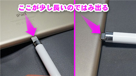 こちら側にライトニングケーブルを差し込むと、ぶかぶかですぐに抜けてしまうので注意してください。こちらはApple Pencilを差し込む側です。