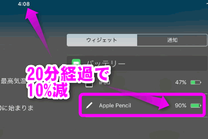 さすがに使用しているとバッテリーのヘリは加速しました。40分連続でApple Pencilを使用した場合、3%ほどのバッテリーを消費しました。