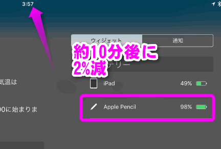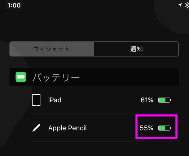 Apple Pencilをくっつけると画面上に一定時間Apple Pencilのバッテリー残量が表示されます。