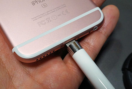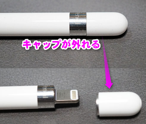 ペンの後ろがキャップになっていて、外すとLightning端子(オス)が出てきます。キャップは磁石でペンとくっついているようで、大抵は勝手に抜け落ちたりしません(意外と強力です)。