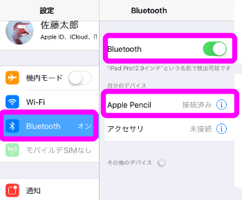 設定の「Bluetooth」を開き、Bluetoothがオンになっているか確認し、「自分のデバイス」に「Apple Pencil」があるか確認してください。