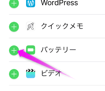 「追加するウィジェット」の中から「バッテリー」を探し、左側にあるプラスのボタンをタップします。