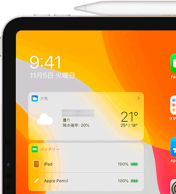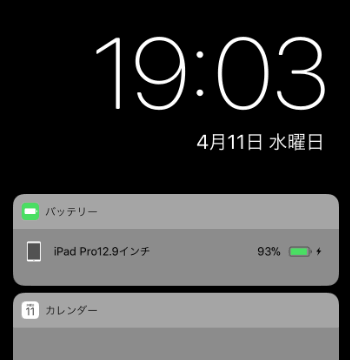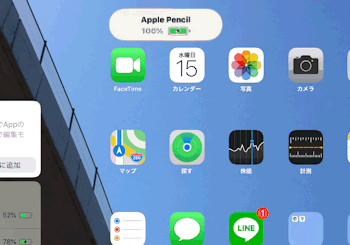 iPadを横向きにするとウィジェットが表示されます。ここにもApple Pencilのバッテリー残量が表示されます。