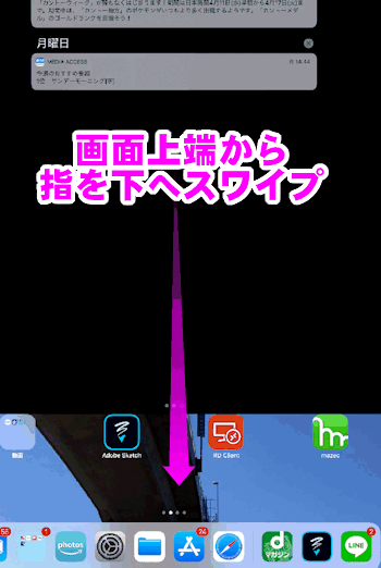 iPadの画面上端から下に指でなぞる(スワイプ)と、「通知センター」と呼ばれるメールなどの通知画面が表示されます。