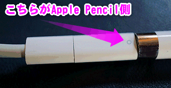 アダプターに小さな丸が記載されている方をApple Pencilに差し込みます。