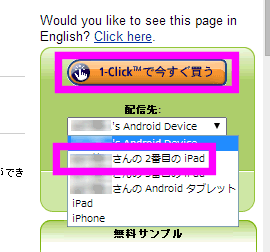 Kindleで扱っている雑誌や本のページへ行き、アマゾンへログインすると、購入ボタンのところに「配信先」を選択することができるので、ここで「iPad」を指定すると、自動的にアプリのKindleに購入したものがダウンロードされます。