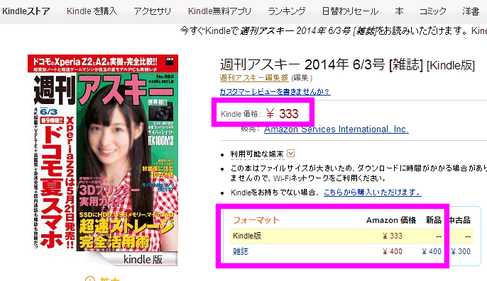 価格も雑誌版に比べ若干安く、例えば日経トレンディは雑誌版は580円ですが、Kindle版は430円。