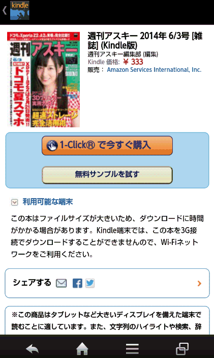 iPadで週刊アスキーの電子書籍版を読むには、主にアマゾンのKindleかAppleが提供する、Newspaperを利用するか、になるんですが、アマゾンのKindle版だと新作で333円。