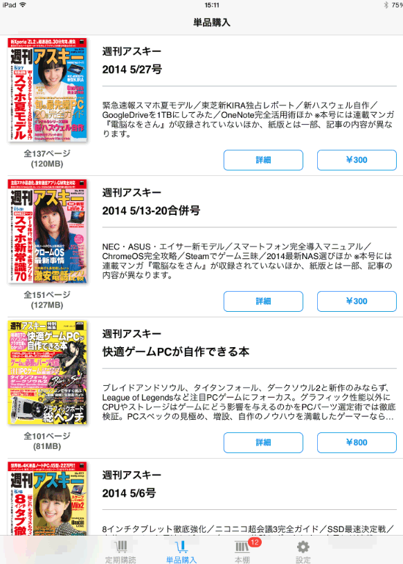 私が購入している雑誌版の週刊アスキー。毎回iPadで読めるようにスキャナーでPDFにしてたのですが、ようやく電子書籍版のアスキーが発売されました。